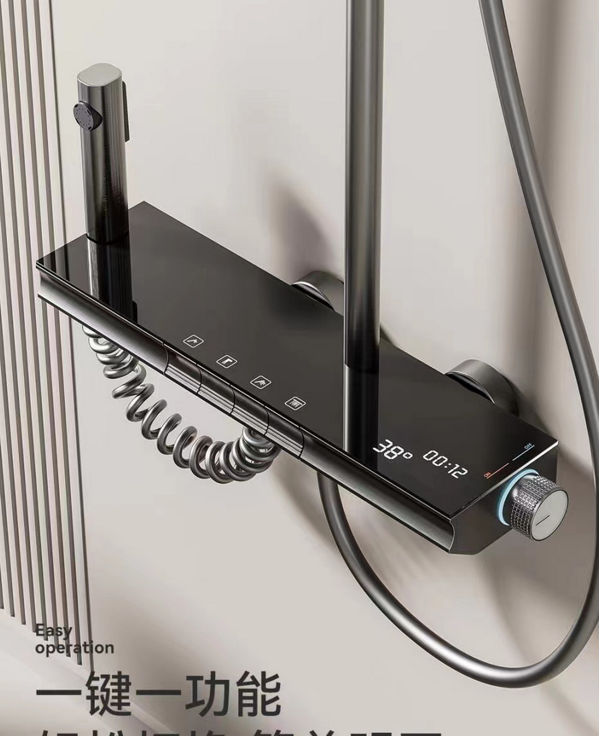智能感温数显,看得见的温度,47公分超长置物平台,方便陈列各种洗浴用品,卫浴空间整洁美观,艺术钢琴设计,一键一控,独立控水,低调内敛的贵族灰,升华空间轻奢艺术感,打造品质家居。
