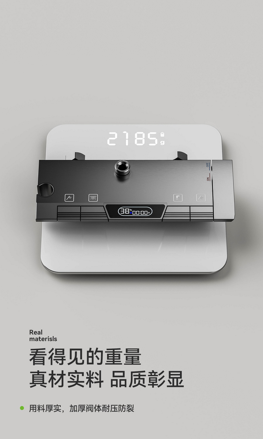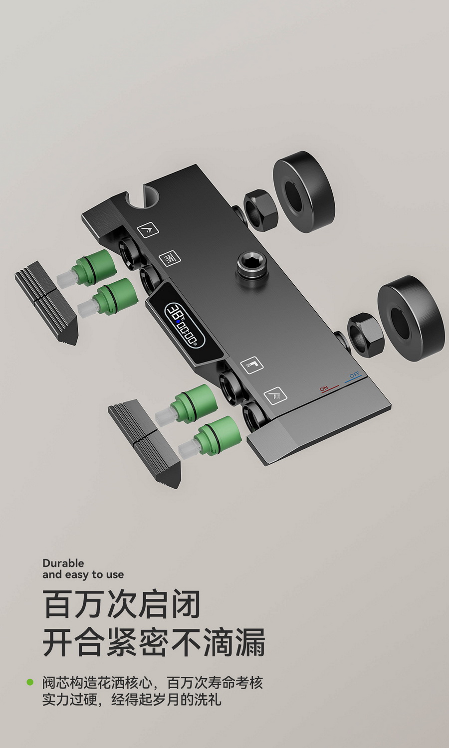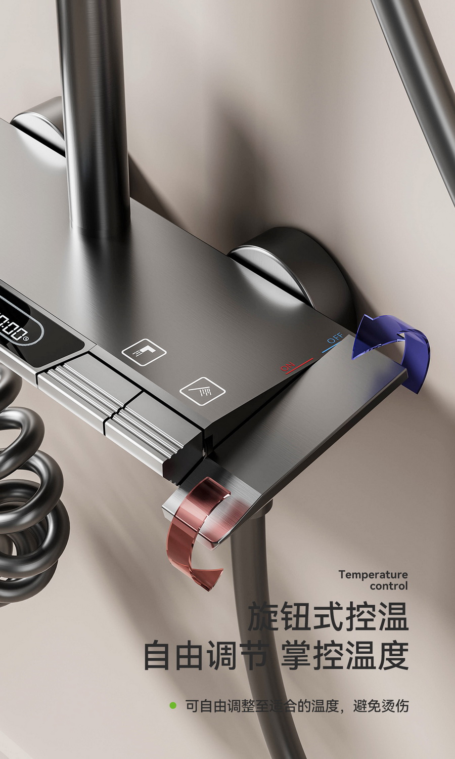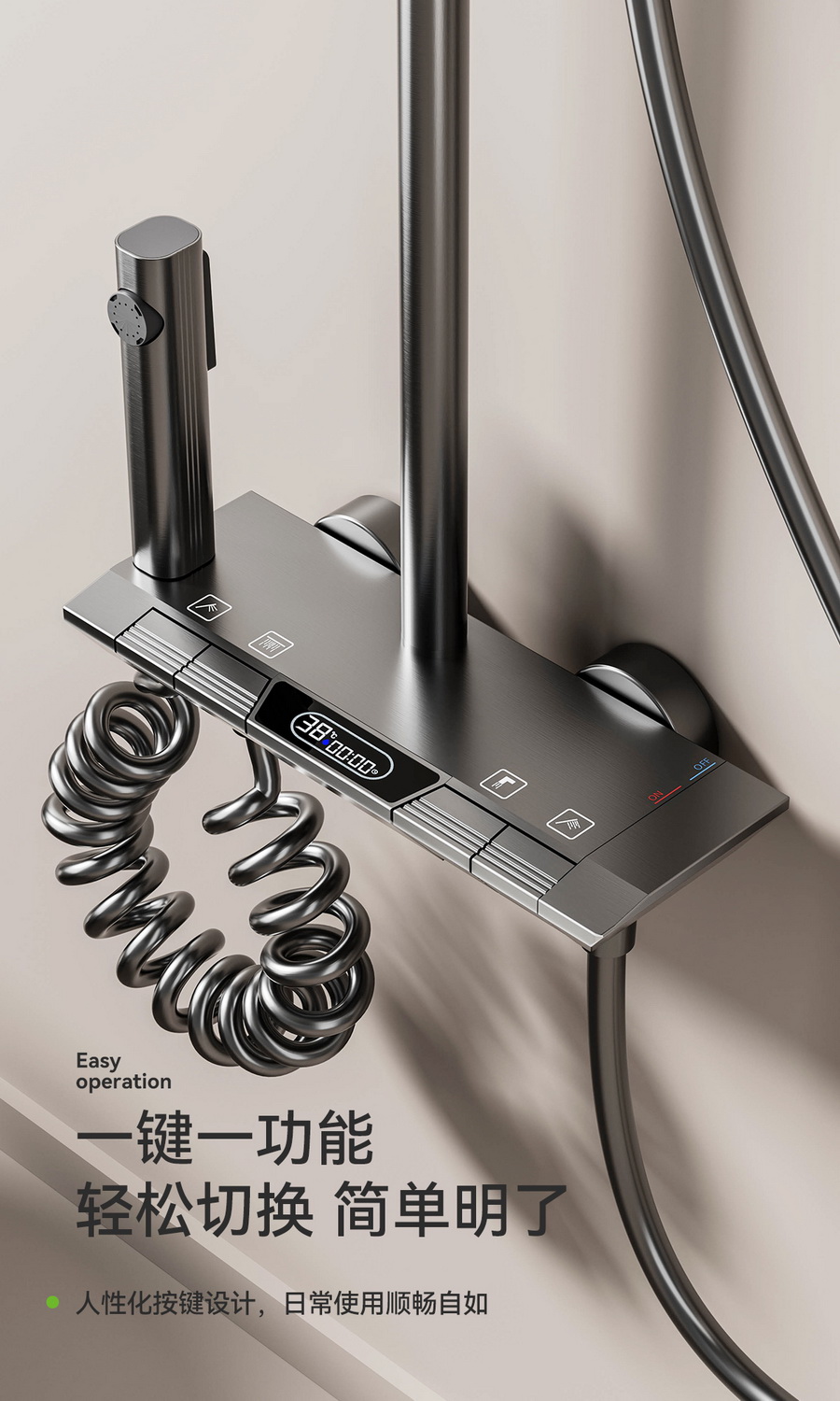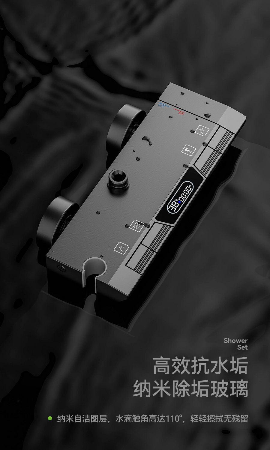 智能感温数显,看得见的温度,艺术钢琴设计,一键一控,独立控水,多功能手持花洒,全新液态高弹性硅胶材质,只需轻轻用手摩擦硅胶,出水孔即可去除水垢,干净卫生。