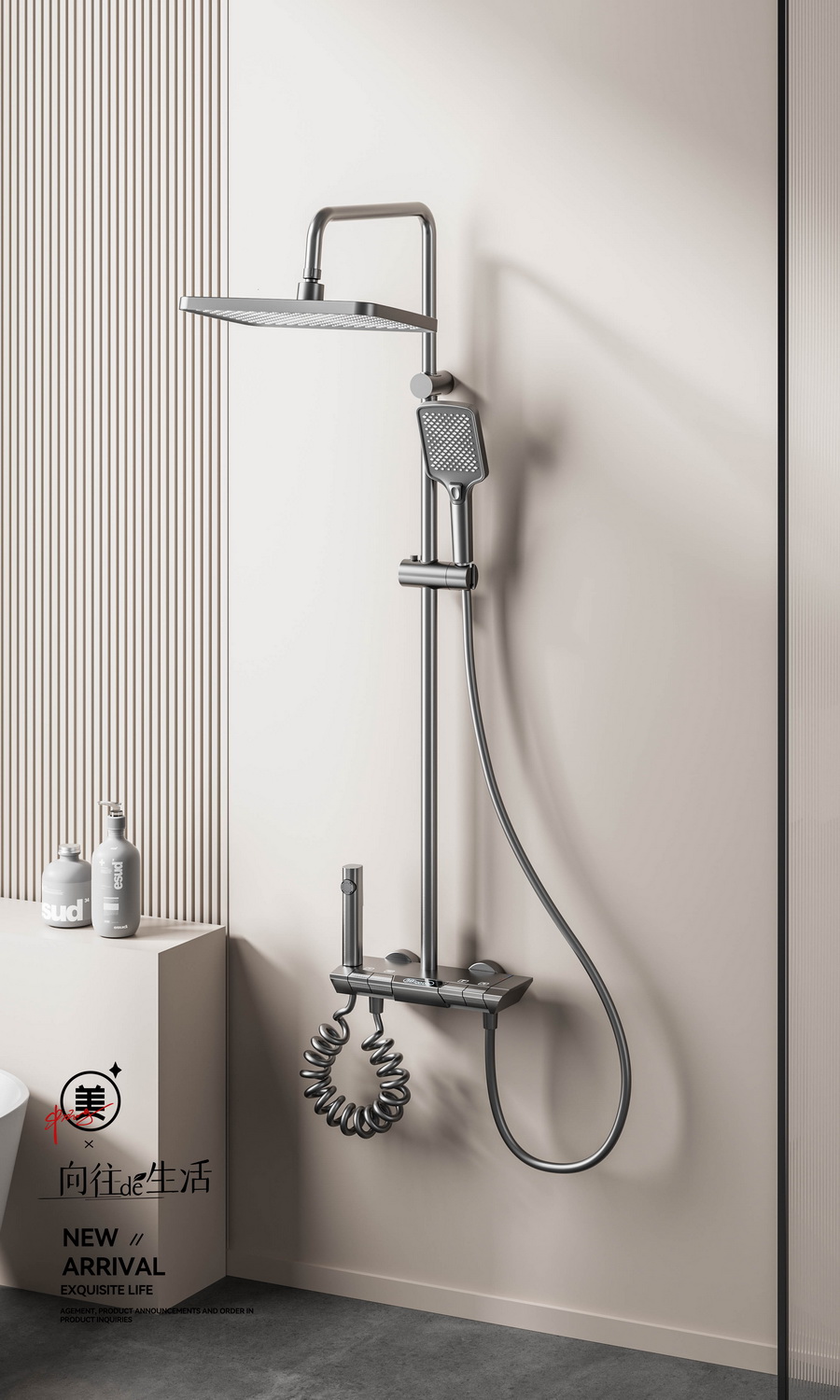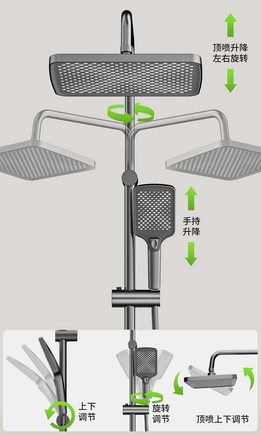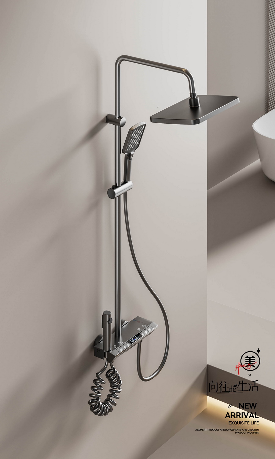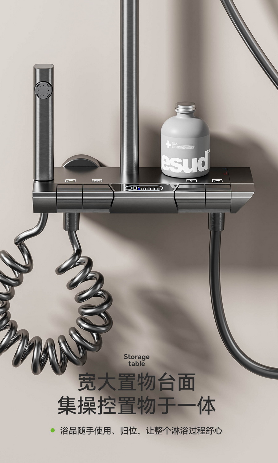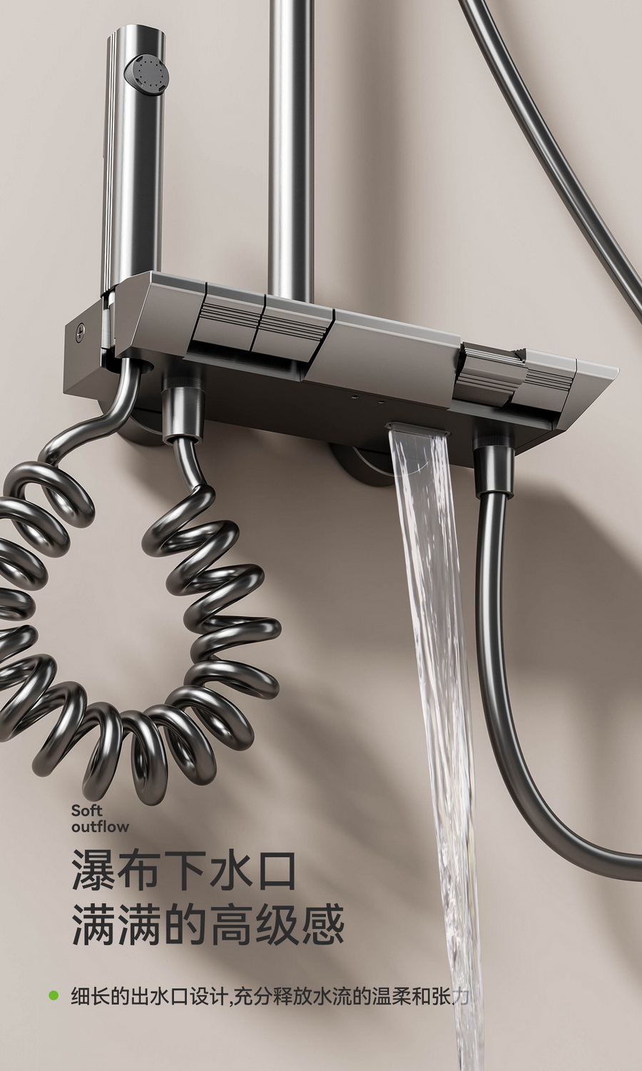 智能感温数显,看得见的温度,艺术钢琴设计,一键一控,独立控水,多功能手持花洒,全新液态高弹性硅胶材质,只需轻轻用手摩擦硅胶,出水孔即可去除水垢,干净卫生。