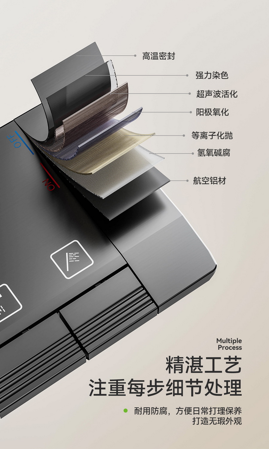 全套外部采用航空铝镁材质,精湛工艺打造,耐刮耐刷,不生锈,日常清洁只需轻轻擦拭即可,帮您减轻家务负担