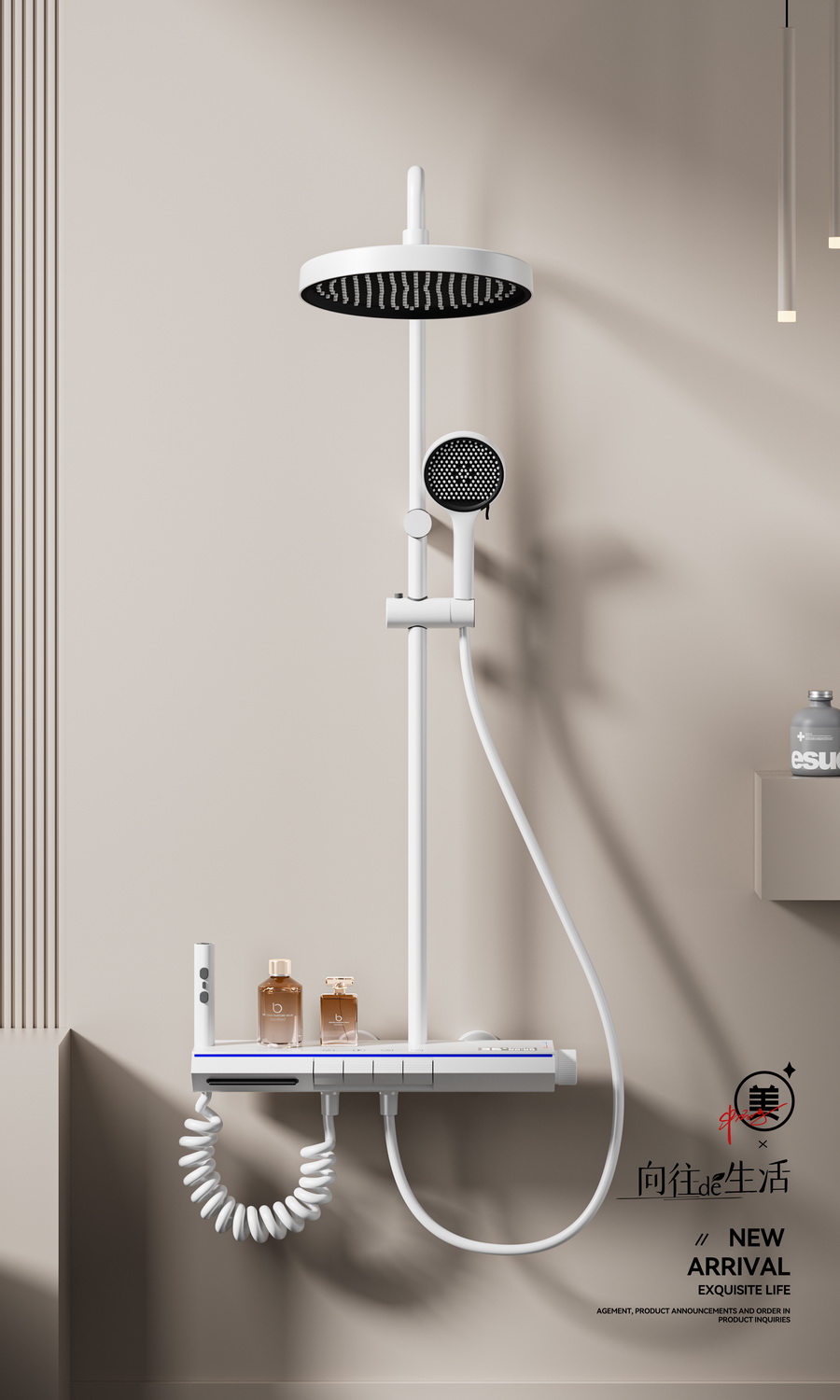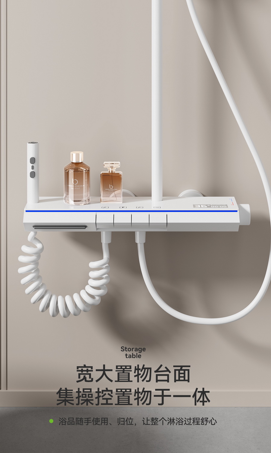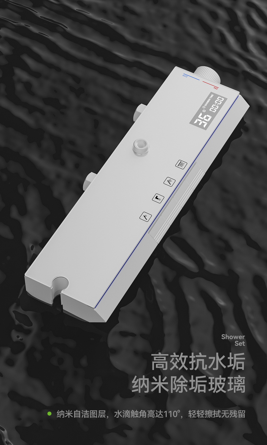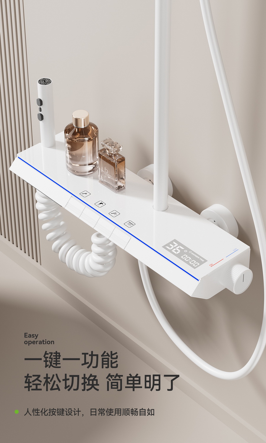 智能感温数显,看得见的温度,高贵典雅珍珠白,尽显奢华,探索最大面积的置物平面与操作体验,艺术钢琴设计,一键一控,独立控水,巨幕雨淋出水,让水拥有智慧,给您更贴心的关怀,纵享酣畅淋漓的沐浴。