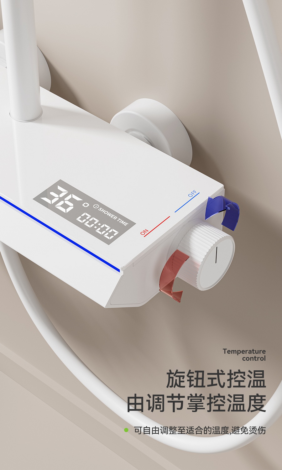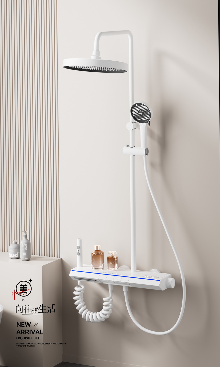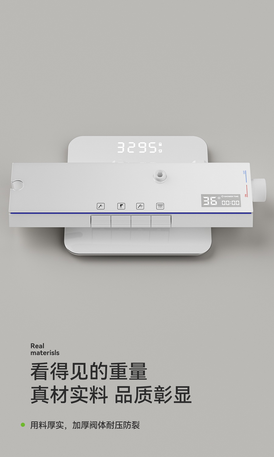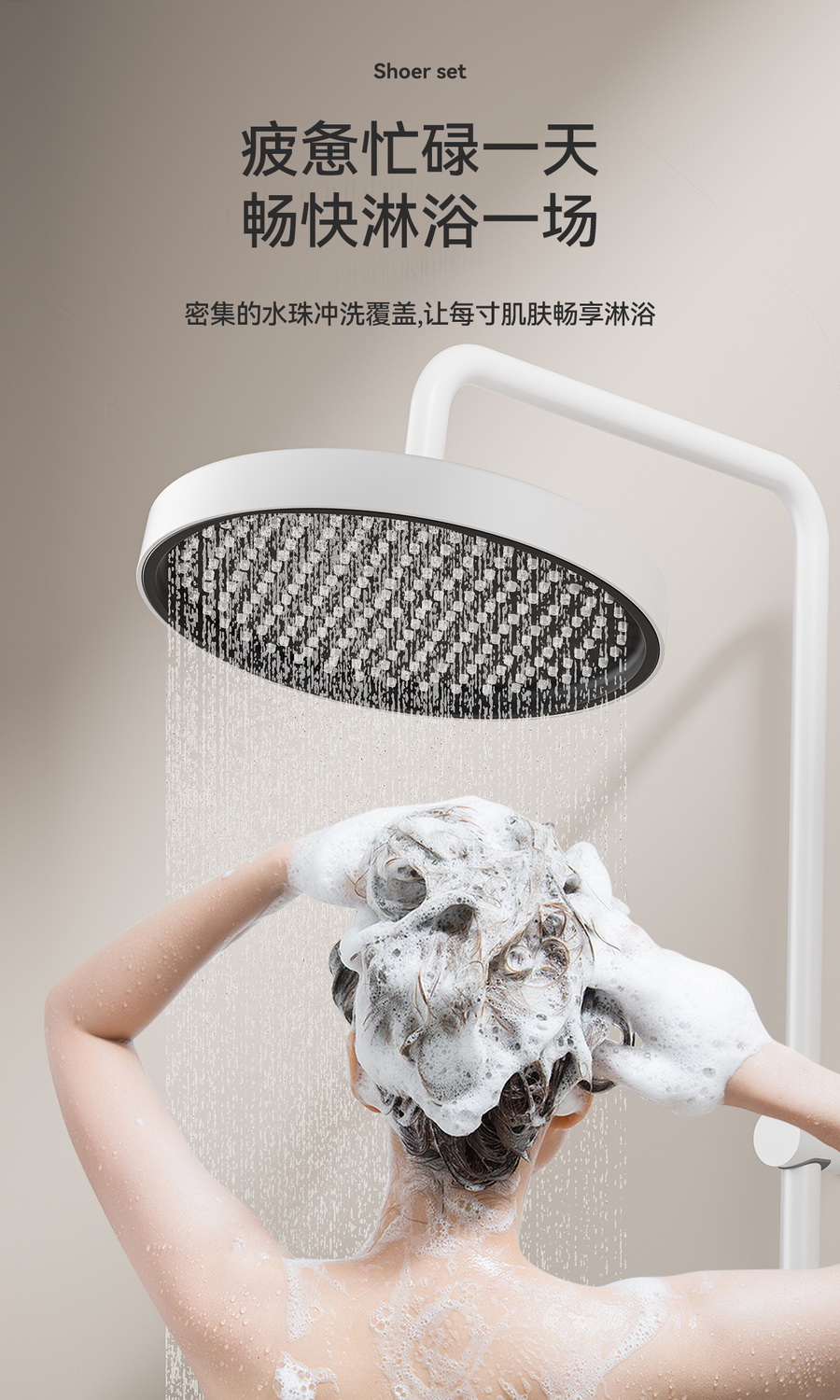 智能感温数显,看得见的温度,高贵典雅珍珠白,尽显奢华,探索最大面积的置物平面与操作体验,艺术钢琴设计,一键一控,独立控水,巨幕雨淋出水,让水拥有智慧,给您更贴心的关怀,纵享酣畅淋漓的沐浴。